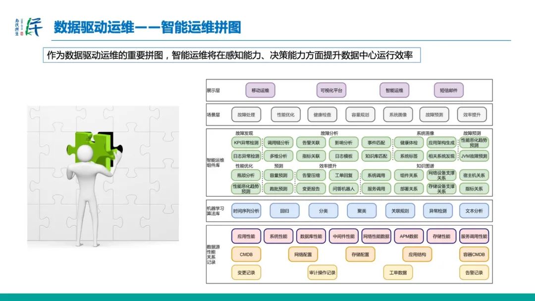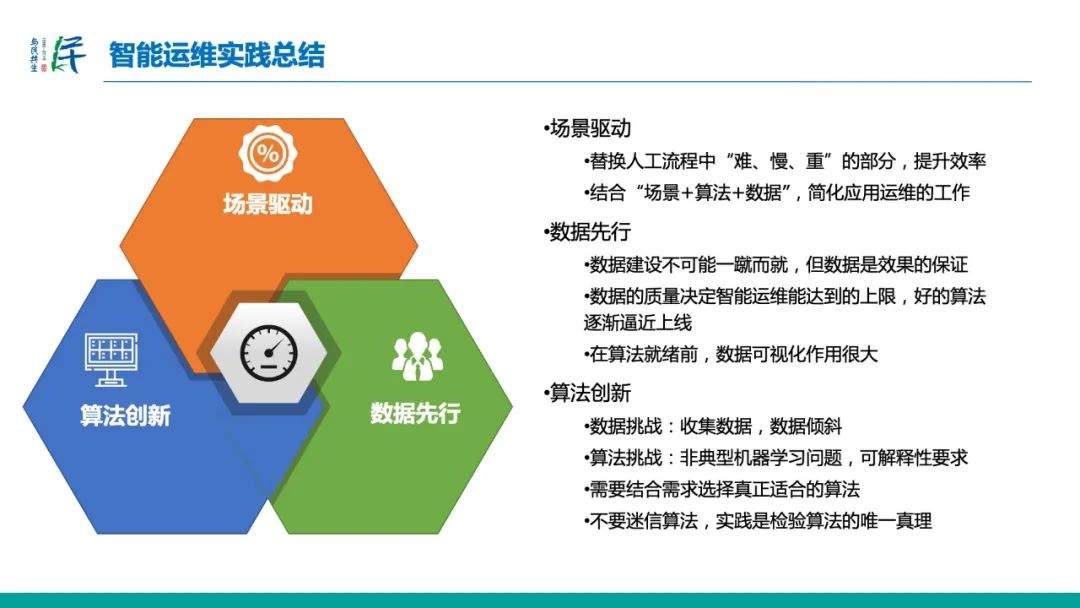 最后是场景驱动。刚开始做智能运维难度很大,因为这是一个全新的课题,所以我们当时决定通过场景驱动的方式,找到日常运维工作中特别难、特别慢、特别繁琐又亟需提升效率的场景,集中精力去突破,通过“算法+数据”的方式来简化运维工作。