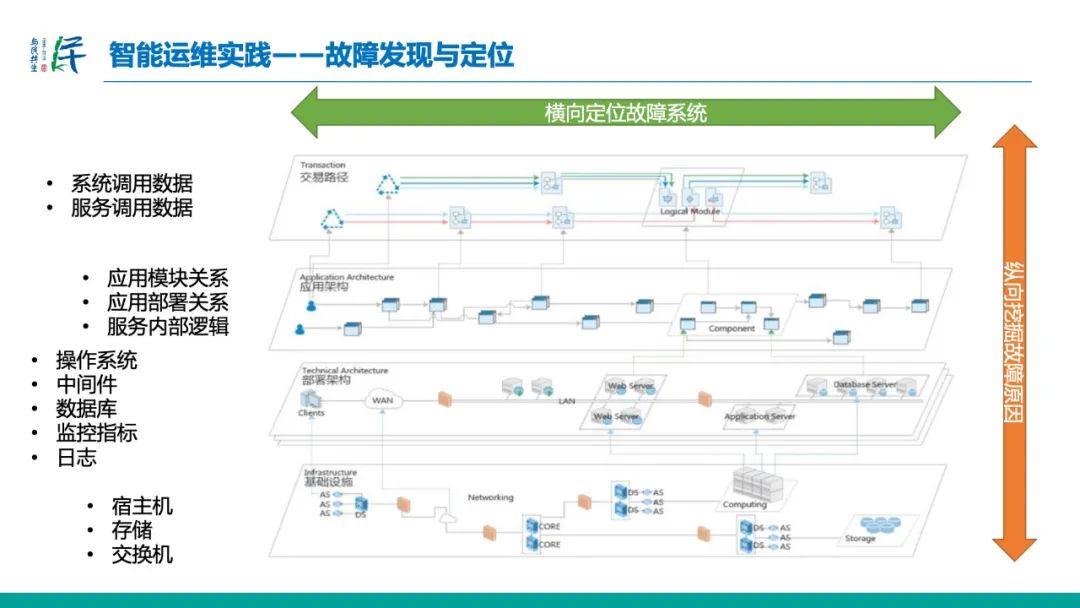 下图左侧是我们需要用到的数据,在横向故障定位的时候,需要用系统调用数据以及系统间服务调用数据来分析;在下一层应用架构逻辑部署关系上,利用好应用模块关系、应用部署关系以及服务内部逻辑;在底层用传统软件模块上,根据各自模块的特点,各个突破,找到各自的故障定位逻辑;在基础设施方面,我们对服务器、交换机和存储也有详尽的数据。