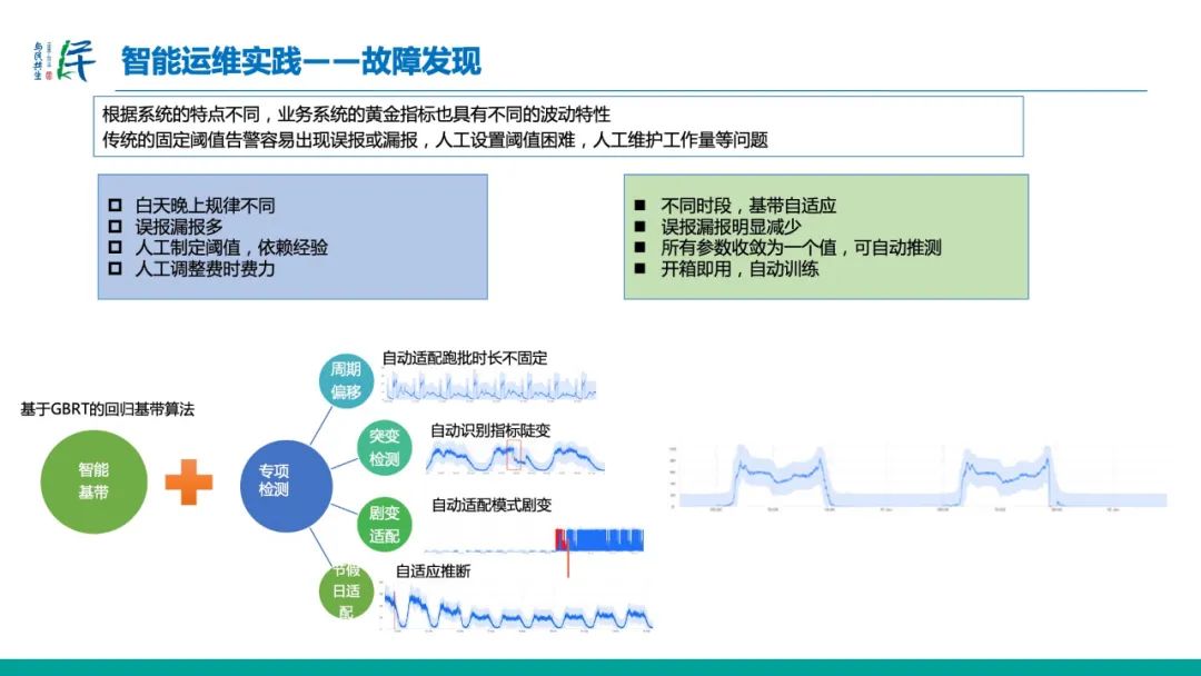 其实,做故障发现不是一件容易的事情。我们要做故障发现算法一定要适用于各个系统,但银行各个系统的运行特点不一样,比如性能指标每天的曲线、每周的曲线、每月的曲线都不一样,所以做智能运维算法的时候要做很多考量,比如考虑系统批处理时间的影响,识别一些指标的陡升陡降,因为一些业务的关停或新开,可能就会出现陡升陡降的情况。再比如春节、国庆等节假日,指标与平时不一样,也需要算法有效识别出来,保证故障异常发现的准确性。这规避了传统监控方法要设置不同的阈值,而且阈值要根据业务变化进行人工调整。现在我们直接用智能算法就能检测业务KPI的异常。