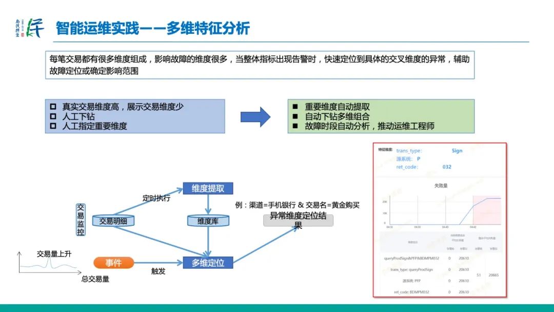 从下图右下方可以看出,通过多维特征分析,可以直观看到异常交易类型是什么、调用交易的源系统是哪一个、调用返回码是什么。我们通过智能运维算法直接把多维数据分析结果显现出来,省去逐步查看日志、查看系统监控指标、分析数据和原因的过程,节省了大量的时间和人力。