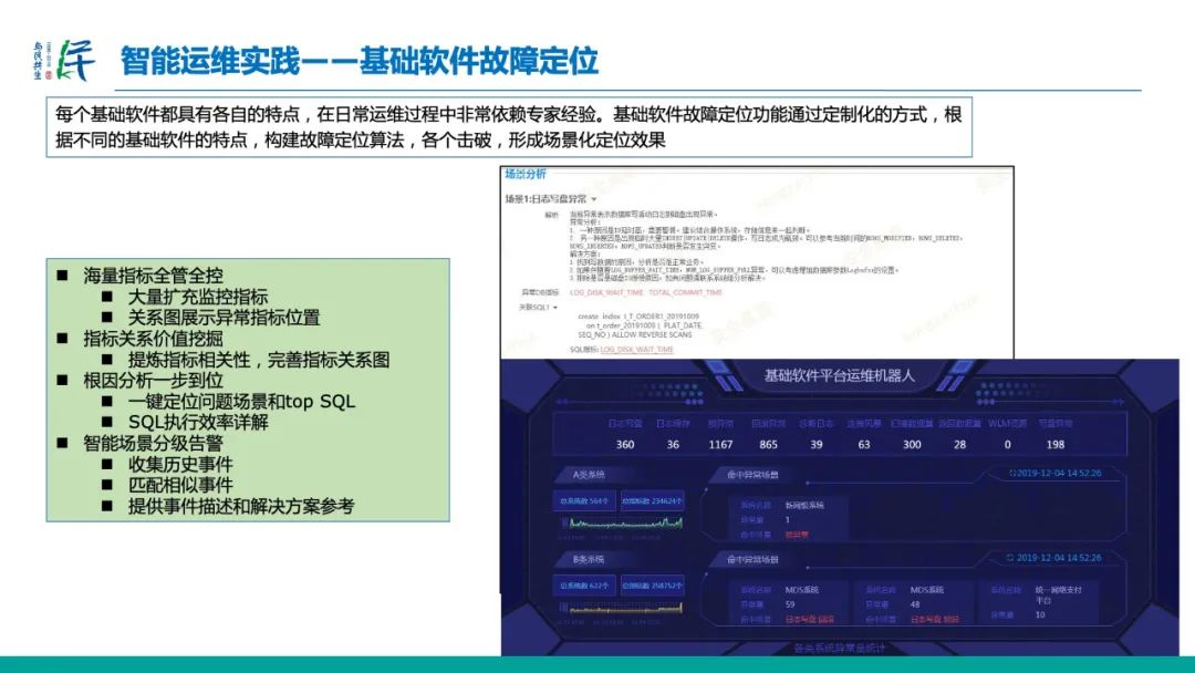 我们在做基础软件故障定位时,其实是借助运维专家的专家知识,梳理成一个指标的集合,对指标进行整体的管理管控,同时构建指标之间的影响关系图,然后可以用一些算法去定位系统中到底哪个指标出了异常。这是我们现在在数据库层面做的故障定位,可以做到一键定位问题,分析出数据库里面运行的Top SQL,及时发现SQL执行效率降低的问题。