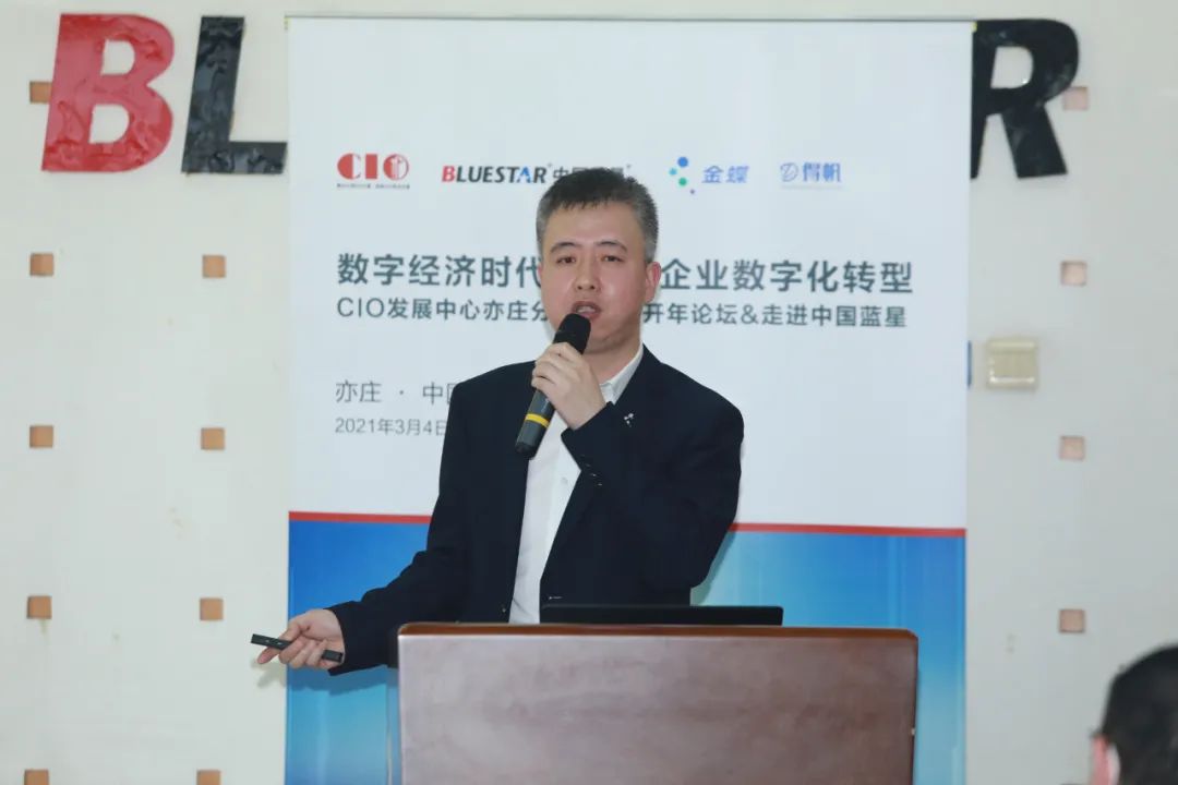 在嘉宾演讲环节,中国蓝星CIO陈一夫首先带来题为《中国蓝星的数字化转型之路》的分享。他指出,蓝星的数字化转型分为两个阶段、五个步骤,第一阶段通过内外部流程数字化,推动业务运营模式的改造,使企业具备敏捷交付的能力。第二阶段,基于商业生态系统所释放的个性化灵活方案推动创新,不断塑造对自身有利的生态环境,实现经济效益最大化。按照数字化流程、数字化分析、自动化作三大主线,依托统一策略、组织机制、能力养成、文化氛围四大支撑,蓝星在生产管理、销售管理、供应链管理、设备管理、HSE五大领域实现了更加高效智能的运营,进一步促进了企业的降本增效。