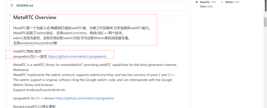 项目原名称是Yangrtc,后面由于元宇宙的出现,故改名为metartc,现在作者目的是致力于嵌入式端,所以开发用纯c语言来实现,该项目的源代码地址如下: