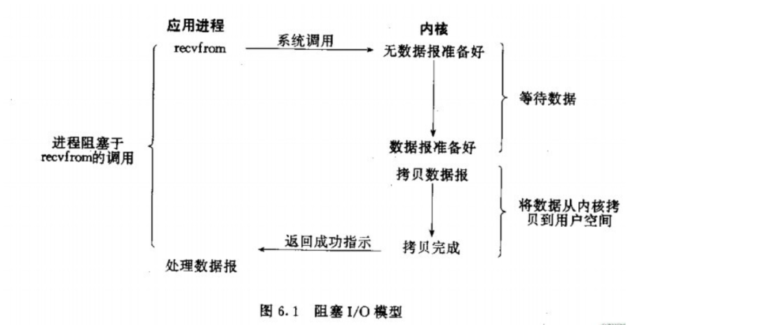阻塞I/O模型图:在调用recv()/recvfrom()函数时,发生在内核中等待数据和复制数据的过程。
