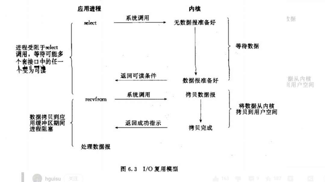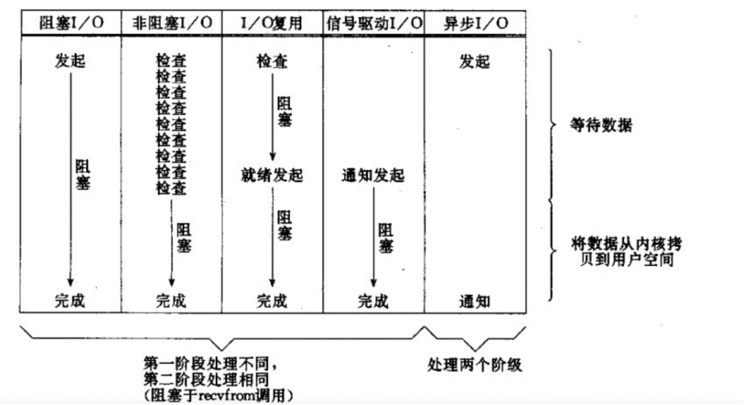 应用程序调用一个IO函数,导致应用程序阻塞,等待数据准备好。如果数据没有准备好,一直等待….数据准备好了,从内核拷贝到用户空间,IO函数返回成功指示。
