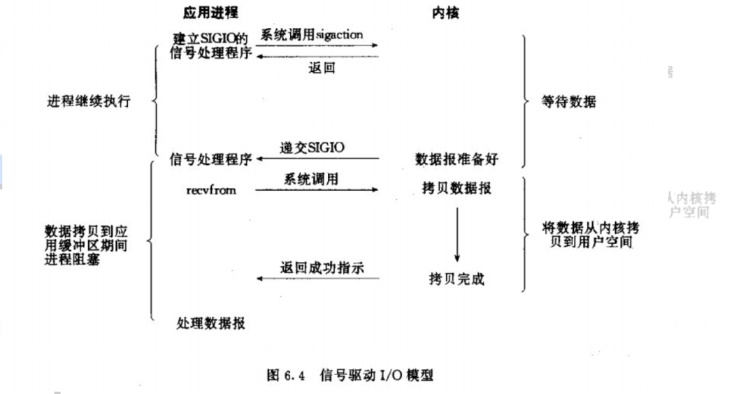 首先我们允许套接口进行信号驱动I/O,并安装一个信号处理函数,进程继续运行并不阻塞。当数据准备好时,进程会收到一个SIGIO信号,可以在信号处理函数中调用I/O操作函数处理数据。