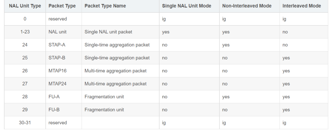 对于 Non-interleaved mode,包含 single NAL unit packets,STAP-As 和 FU-As,不能包含 STAP-Bs,MTAPs 和 FU-Bs。协议要求接收方应该支持,即在一般场景都应该支持。这也是现在应用最广的模式,在通信领域,在互联网通信基本上都会支持。