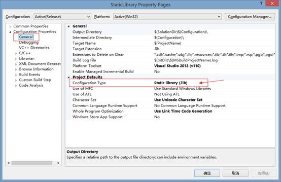 当然,我们一般不这么用,使用VS工程设置更方便。创建win32控制台程序时,勾选静态库类型;打开工程“属性面板”、”配置属性”、”常规”,配置类型选择静态库。