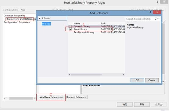 工程“属性面板”、“通用属性”、 “框架和引用”、”添加引用”,将显示“添加引用”对话框。“项目”选项卡列出了当前解决方案中的各个项目以及可以引用的所有库。在“项目”选项卡中,选择 StaticLibrary。单击“确定”。