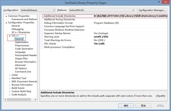添加StaticMath.h 头文件目录,必须修改包含目录路径。打开工程“属性面板”、”配置属性”、 “C/C++”、常规”,在“附加包含目录”属性值中,键入StaticMath.h 头文件所在目录的路径或浏览至该目录。