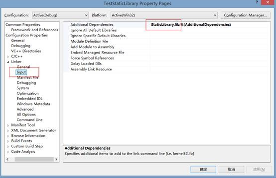 “属性面板”、配置属性”、“链接器”、输入”,附加依赖库中输入静态库名StaticLibrary.lib。