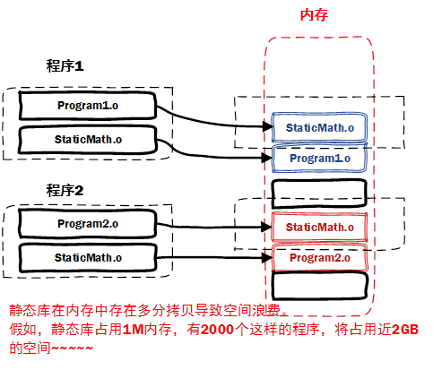 浪费空间和资源,因为所有相关的目标文件与牵涉到的函数库被链接合成一个可执行文件。