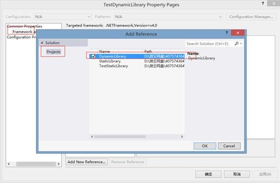 工程“属性面板”、通用属性”、框架和引用”、添加引用”,将显示“添加引用”对话框。“项目”选项卡列出了当前解决方案中的各个项目以及可以引用的所有库。在“项目”选项卡中,选择 DynamicLibrary。单击“确定”。