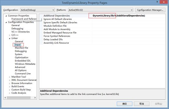 “属性面板”、配置属性”、“链接器”、输入”,附加依赖库中输入动态库编译出来的DynamicLibrary.lib。