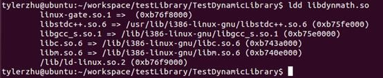 ldd命令可以查看一个可执行程序依赖的共享库,例如我们编写的四则运算动态库依赖下面这些库: