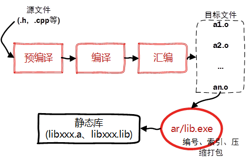 Linux下使用ar工具、Windows下vs使用lib.exe,将目标文件压缩到一起,并且对其进行编号和索引,以便于查找和检索。一般创建静态库的步骤如图所示: