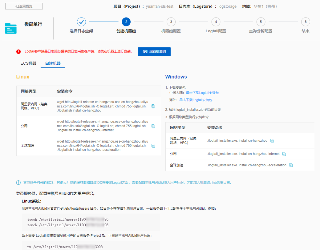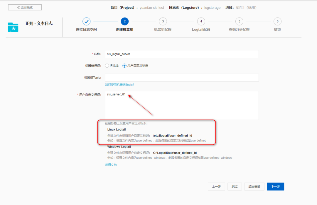 定义好机器组名称,例如sls_logtail_server,并创建一下用户自定义标识