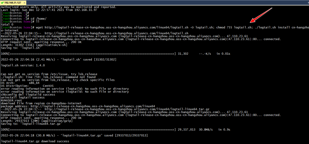 wget http://logtail-release-cn-hangzhou.oss-cn-hangzhou.aliyuncs.com/linux64/logtail.sh -O logtail.sh; chmod 755 logtail.sh; ./logtail.sh install cn-hangzhou-internet