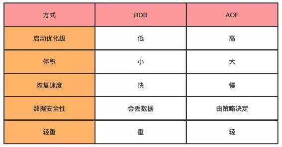 通过下面的表示,我们可以从几个方面对比一下RDB与AOF,在应用时,要根本自己的实际需求选择RDB或者AOF