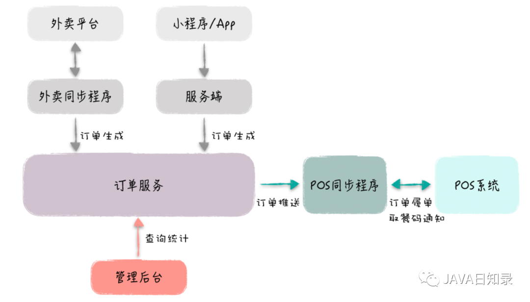 小程序服务端 调用订单服务落地自有线上订单;外卖同步程序接收三方外卖平台的订单,然后调用订单服务落地订单;POS 同步程序通过订单服务拉取订单,并推送给商户内部的收银系统;最后还有一个订单管理后台 ,通过订单服务查询和修改订单。