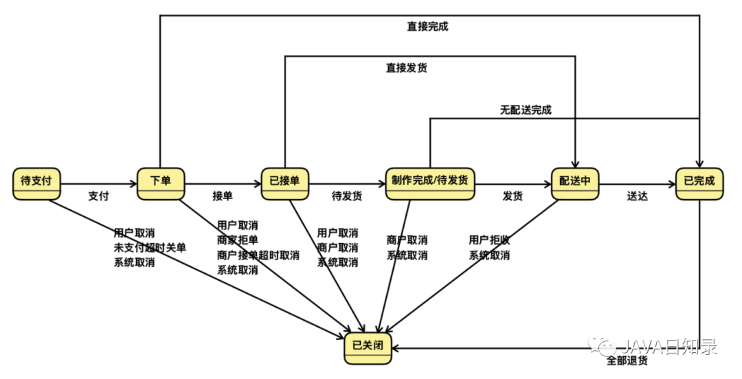 我们知道,无论订单的状态变化是如何的复杂,我们总是可以定义一个订单有哪些基本的状态,包括这些基本状态之间是如何变化的。比如,订单一开始都是用户下单后待支付,支付完成后变成一个有效的订单,然后由商家进行接单,制作完成后进行发货配送等等,订单最终的状态要么是完成,要么是取消。