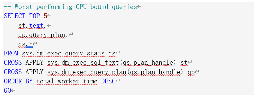 手上有了这些信息找出你性能最差的查询是什么。但首先你要知道什么是你的性能瓶颈——CPU还是I/O限制?如果你的性能瓶颈是CPU限制,你可以用下列查询问SQL Server根据CPU消耗列出前5个最差性能的查询: