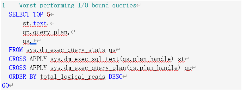 大家可以看到这里我使用了简单的ORDER BY total_worker_time DESC来返回CPU密集的查询。另外也通过调用sys.dm_exec_sql_text和sys.dm_exec_query_plan DMF来抓取SQL语句和执行计划本身。下列代码显示如何依据I/O消耗来找出你性能最差的查询。