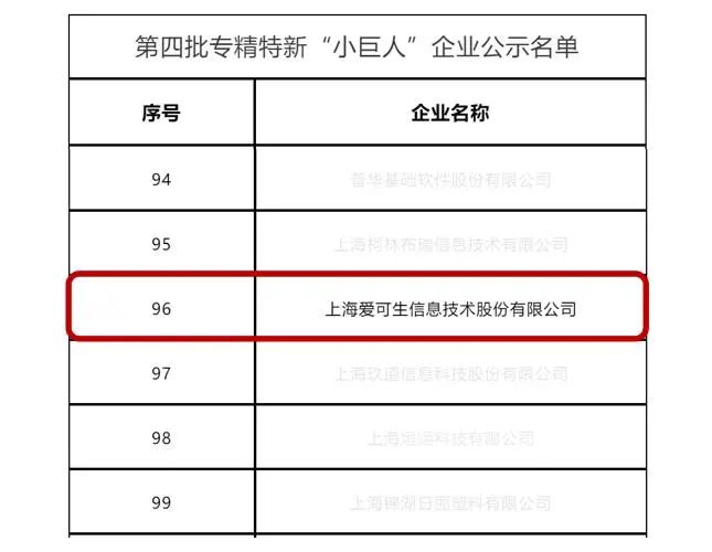 2022年8月8日,由国家工业和信息化部统一审核后,上海市经济和信息化委员会公示了《关于上海市第四批专精特新“小巨人”企业和第一批专精特新“小巨人”复核通过企业名单》,上海爱可生信息技术股份有限公司(简称“爱可生”)成功入选。这是继入选上海市“专精特新”中小企业和上海市科技小巨人企业名单后,成功晋级为国家级专精特新“小巨人”企业。也是继国家规划布局内重点软件企业资质之后,公司获得的又一重量级国家级资质。