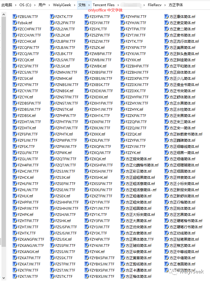 Step 1.准备文档需要用到的中文字体,此处我已经准备好了办公文档所需的中文方正字体,如需下载地址: https://share.weiyigeek.top/f/36158960-649385450-ac6168 (网盘密码回复【onlyoffice中文字体】即获得, 回复地址:https://weiyigeek.top/wechat.html?key=onlyoffice中文字体 )