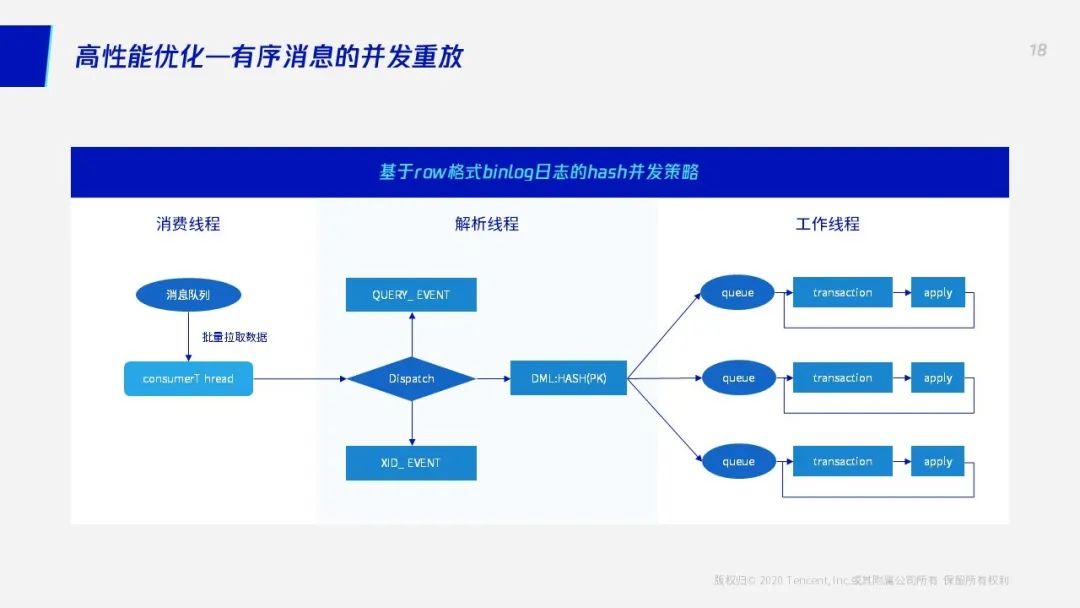 金融业务场景中,往往对数据的实时性要较高,因此对数据同步的性能提出了比较高的要求。为了解决这样的问题,consumer采用了基于行的哈希并发策略实现并行重放。下面以binlog消息为例来说明该策略的实现。