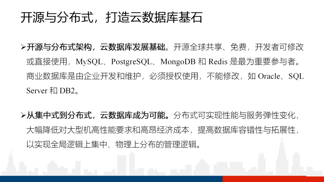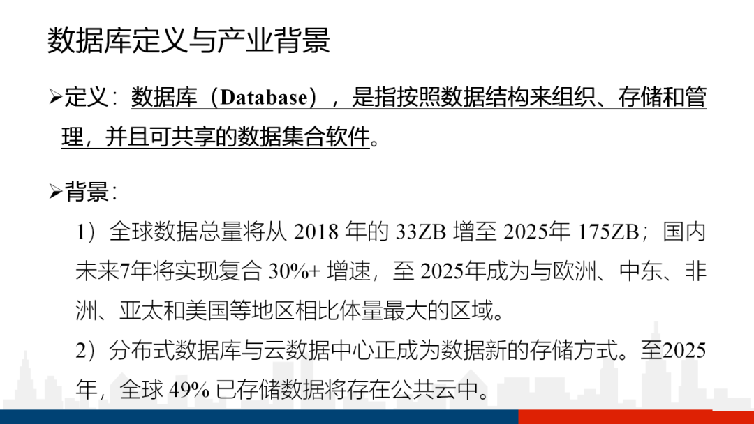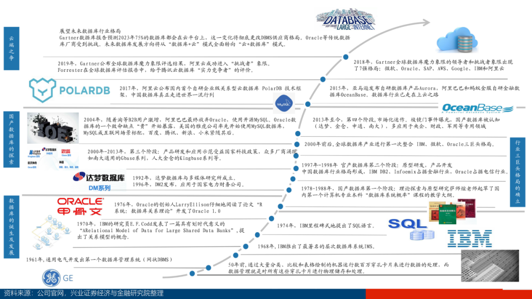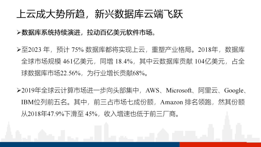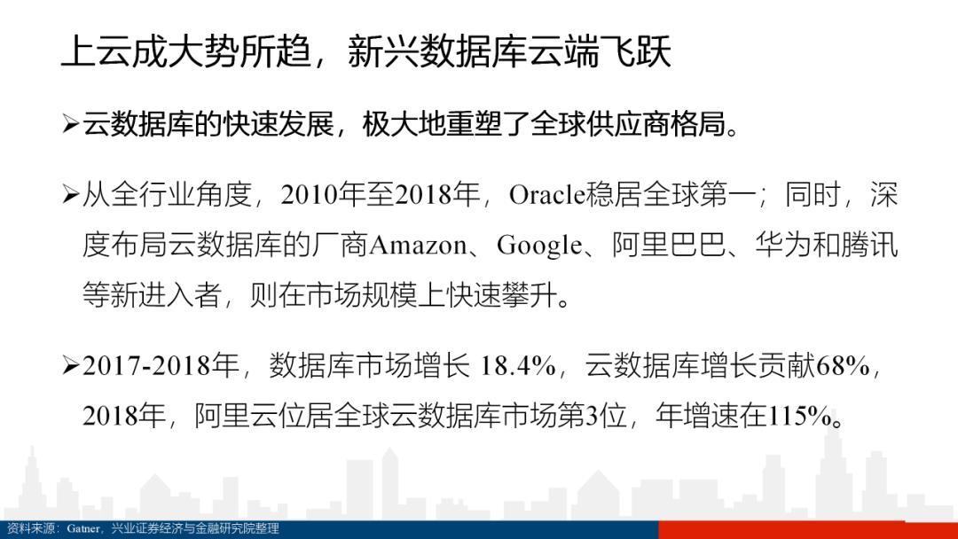 根据Gartner数据,2018年全球数据库市场总量为461亿美元,其中云数据库市场占据104亿美元。2017-2018年整体行业增速达18.4%,高于过去的年复合增长率,其中68%的增长来自于云数据库。Amazon和Microsoft贡献了整个市场75%增长,且几乎都来自于云化增长。越来越多用户正在将系统部署在云中,云带来了数据库产业的创新,云也为传统数据库厂商带来了新的盈利模式。