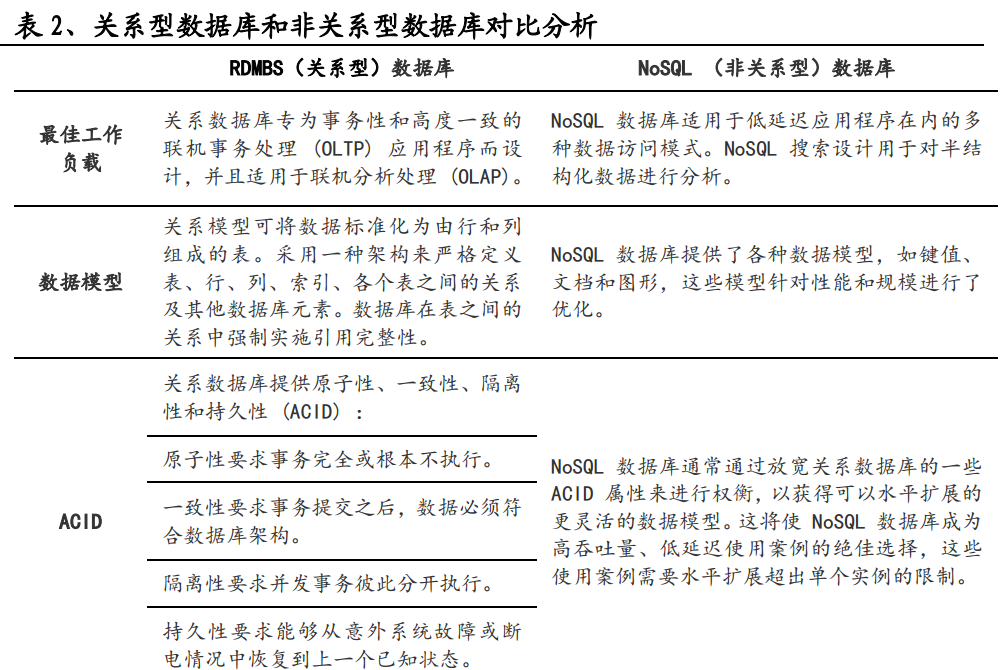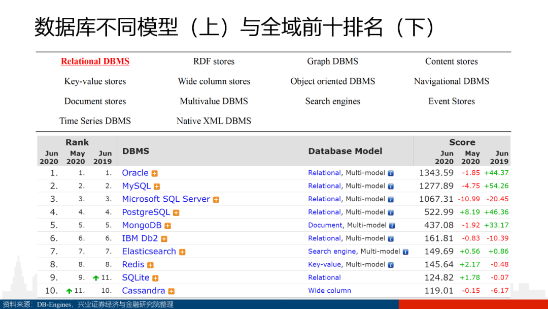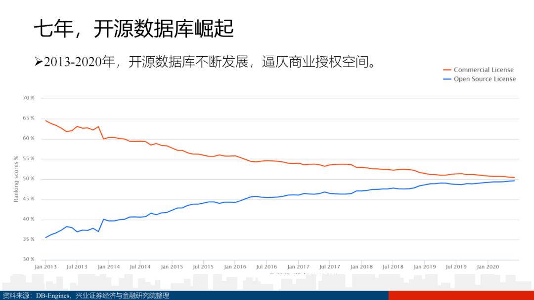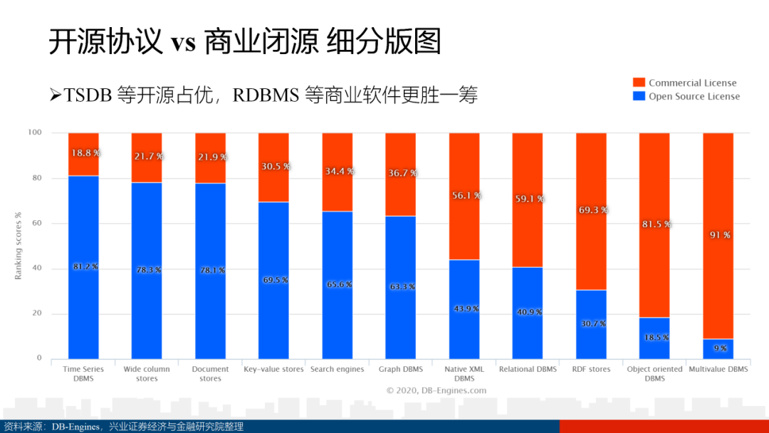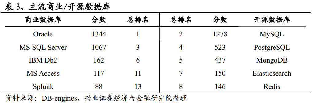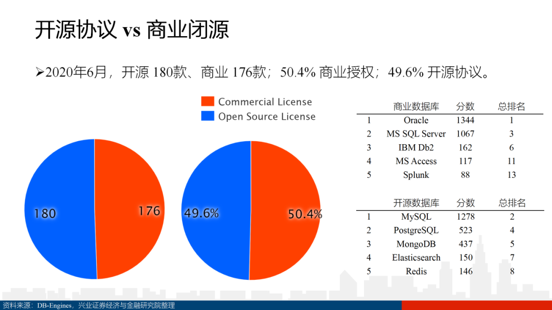 截至2020年6月,全球共有开源数据库180款,商业闭源数据库176款。而从使用率来看,商业授权占比50.4%,开源协议为49.6%。开源数据库源代码全球共享且免费,开发者可对其源码进行修改。MySQL、PostgreSQL、MongoDB和Redis是开源数据库中活跃且重要的成员。商业数据库则由企业开发维护,必须通过授权订阅才可使用,用户不可对其进行修改。Oracle、Microsoft SQL Server和IBM DB2均为主流商业数据库厂商。在商业数据库市场中,主流关系型数据库占据57.3%的份额,市场高度集中。