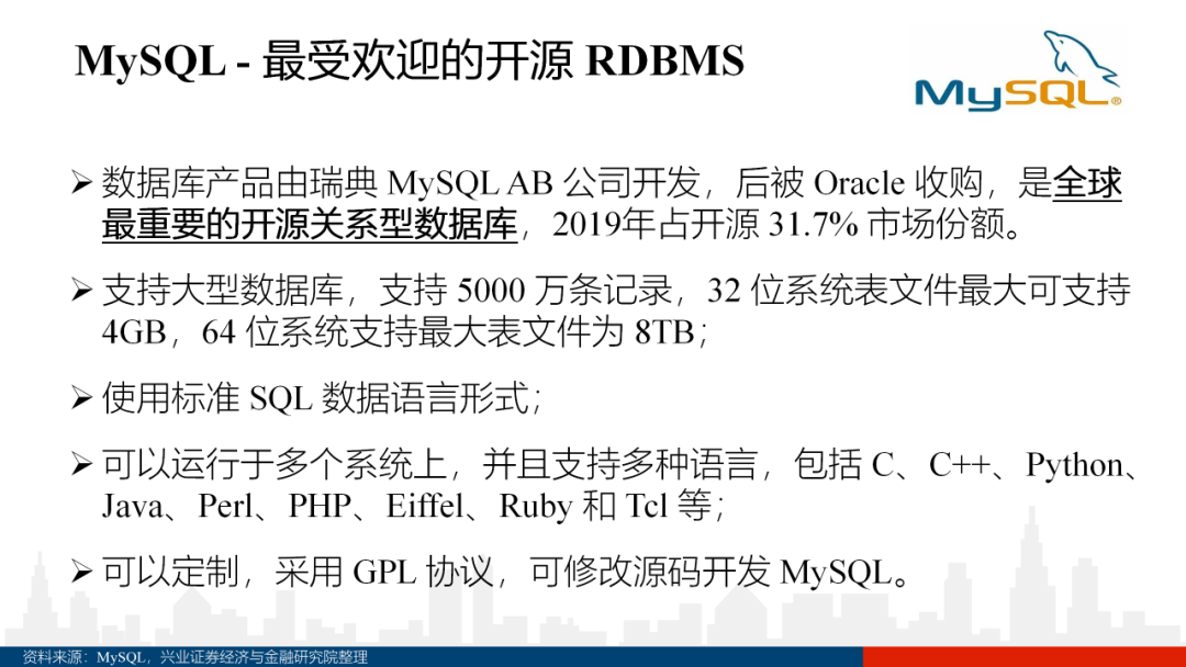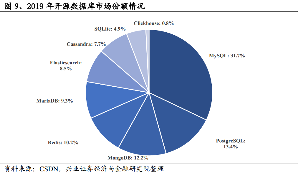 MySQL,开源关系型数据库霸主。2019年,MySQL 在开源数据库市占率为31.7%,多年保持第一份额。MySQL-GPL开源协议可实现:1、自由复制:将软件复制到任何电脑,或者任何地方,复制份数不受任何限制