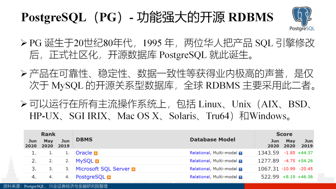 PostgreSQL,与MySQL寡头竞争。加州大学计算机系开发的 PostgreSQL 排名第二,用户占比达 13.4%,非关系型数据库MongoDB 排名第三,市占率为 12.2%,华为高斯数据库(GaussDB)技术来源即为PostgreSQL。