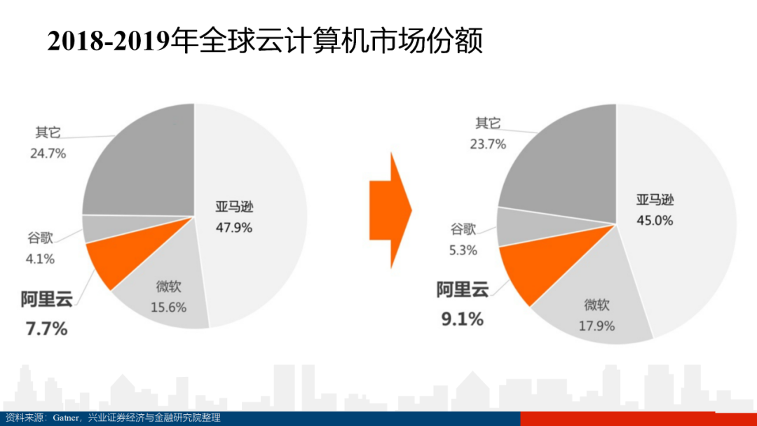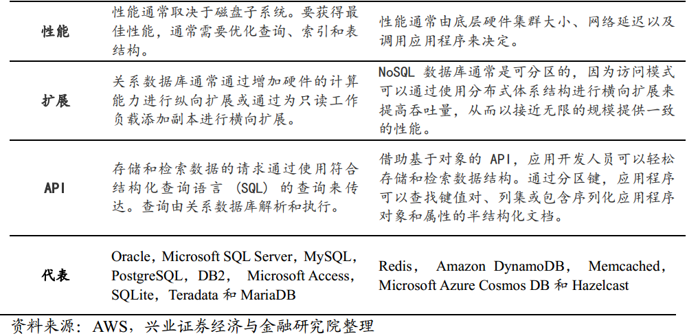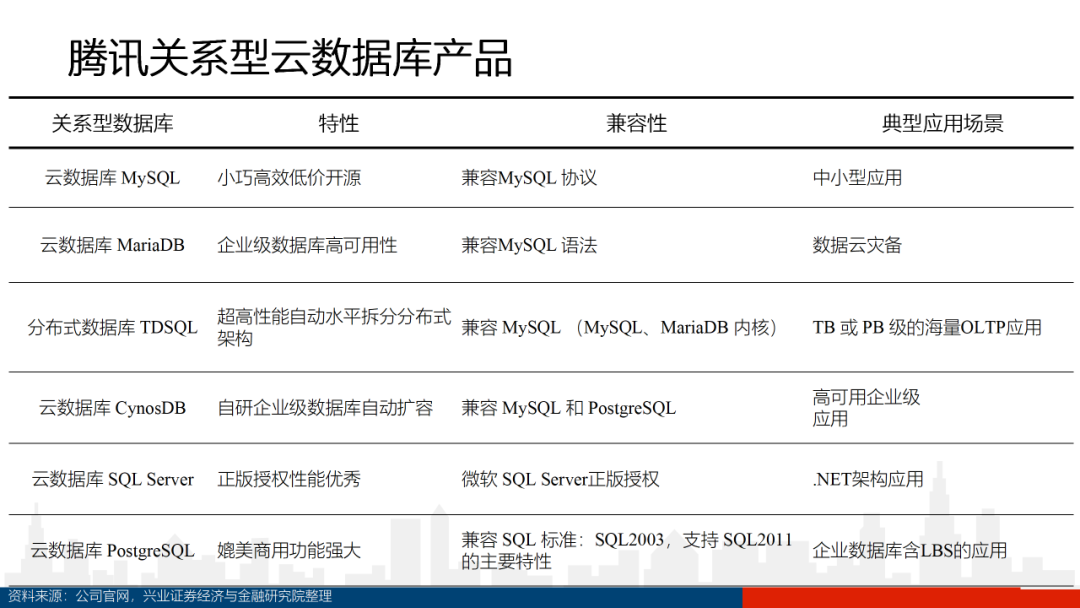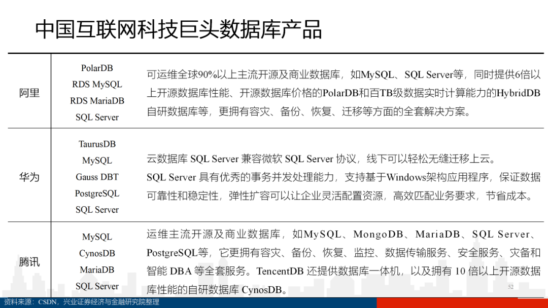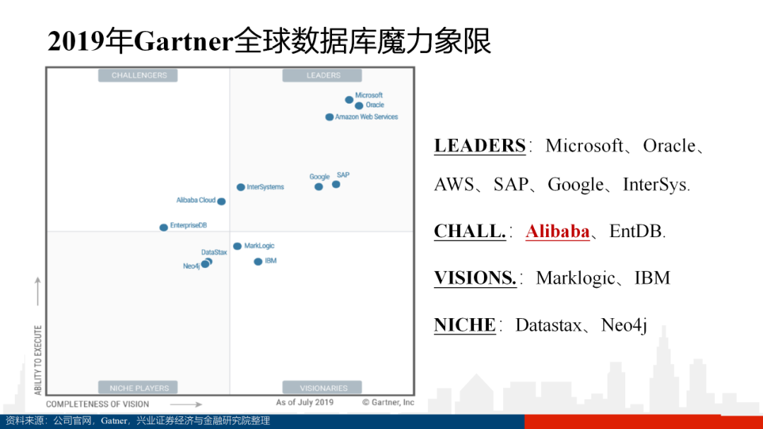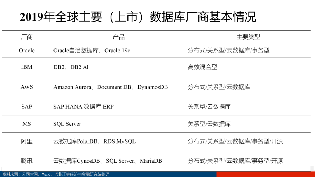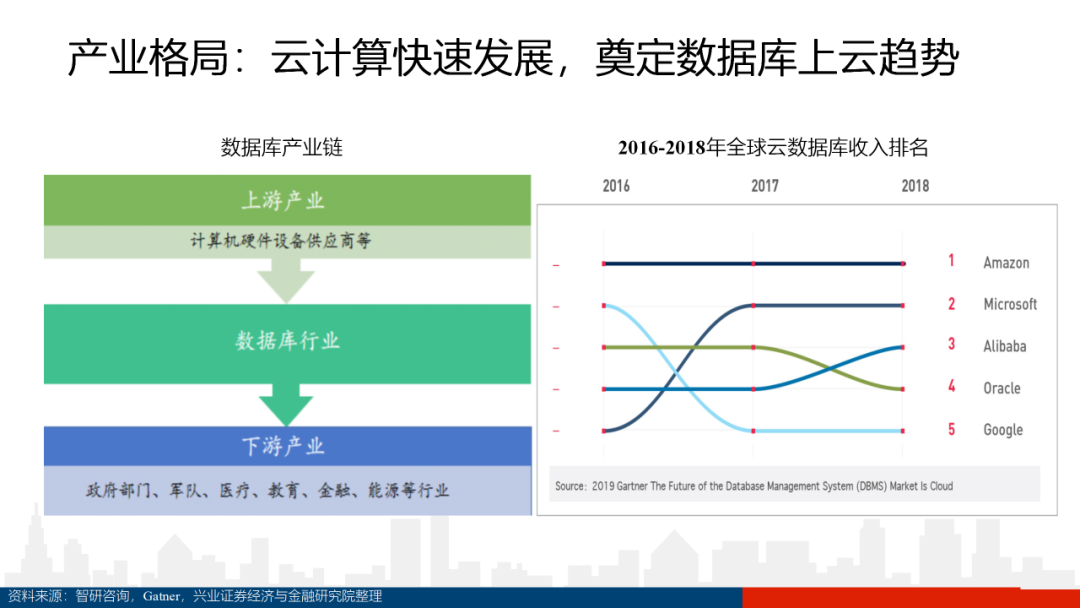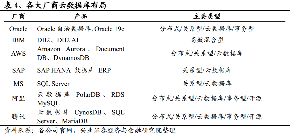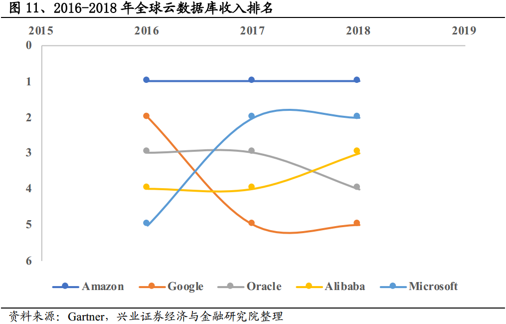 上云,将重塑数据库行业格局。随着数据体量不断激增,基于开源与分布式的云数据库应运而生,快速冲击着传统数据库的市场格局。根据 Gartner 数据显示,在 2013 年Amazon AWS 推出自研数据库产品 Aurora 之后,旗下的云数据库市场占有率不断提升,并在过去三年维持在市场第一的水平。此外,Microsoft 与阿里巴巴也悉数跻身全球云数据库前 3 名。从图4的全球市场排名可看出,Microsoft、Amazon、阿里、Google、华为和腾讯均以云服务转型实现其市场地位的提升。
