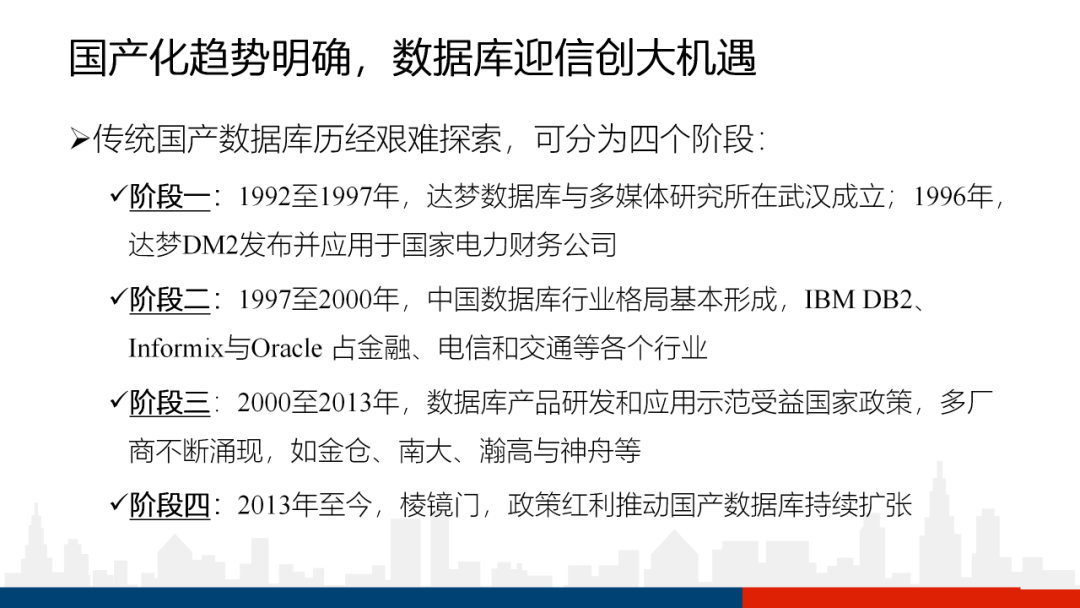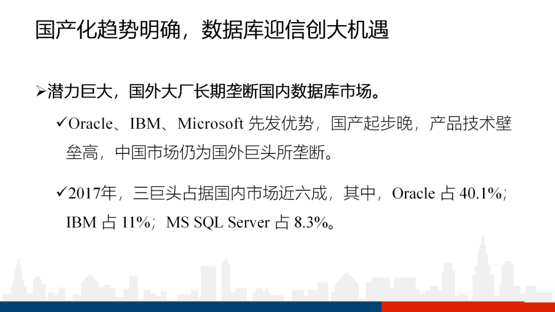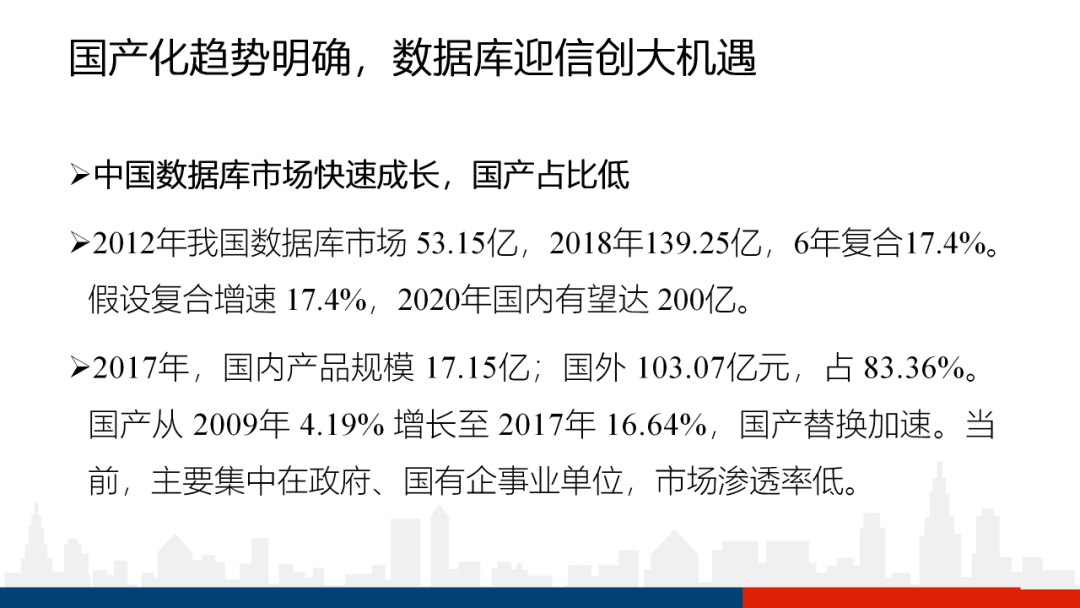 持续重点看好数据库国产化的投资机会,建议关注:科蓝软件、中国软件、太极股份、创意信息、东方国信、海量数据。