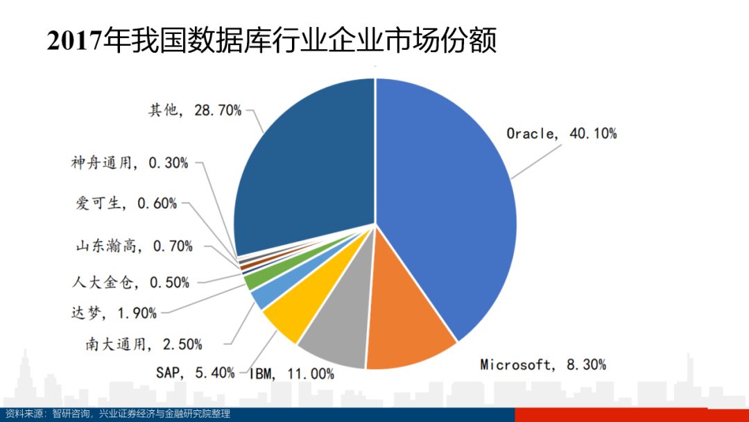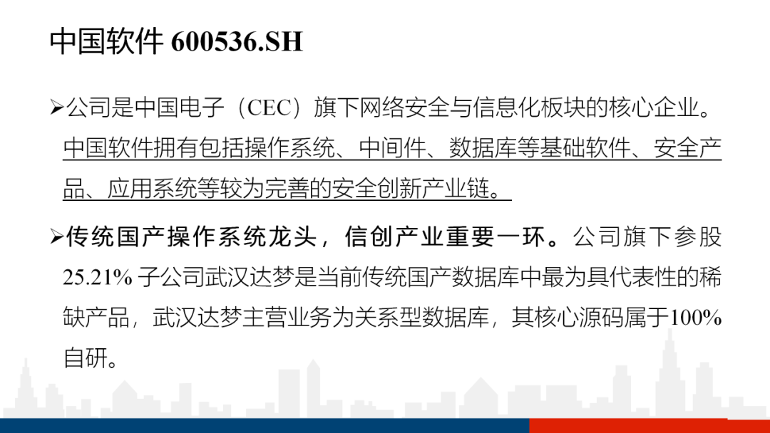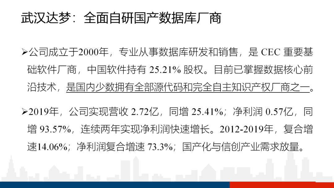 中国软件(600536.SH):武汉达梦(中国软件持有 25.21%股权)成立于2000年,专业从事数据库研发和销售,是 CEC 重要基础软件厂商。公司目前已掌握数据核心前沿技术,是国内少数拥有全部源代码和完全自主知识产权厂商之一。2019年武汉达梦在国产数据库厂商中市占率第一。公司产品拥有稳定市场营销渠道和技术服务网络,覆盖政府、电力、通信和金融等30多个国计民生行业,当前已进入金融、社保、民航和电力等高端应用领域核心交易系统。