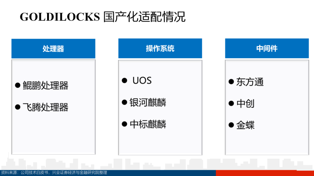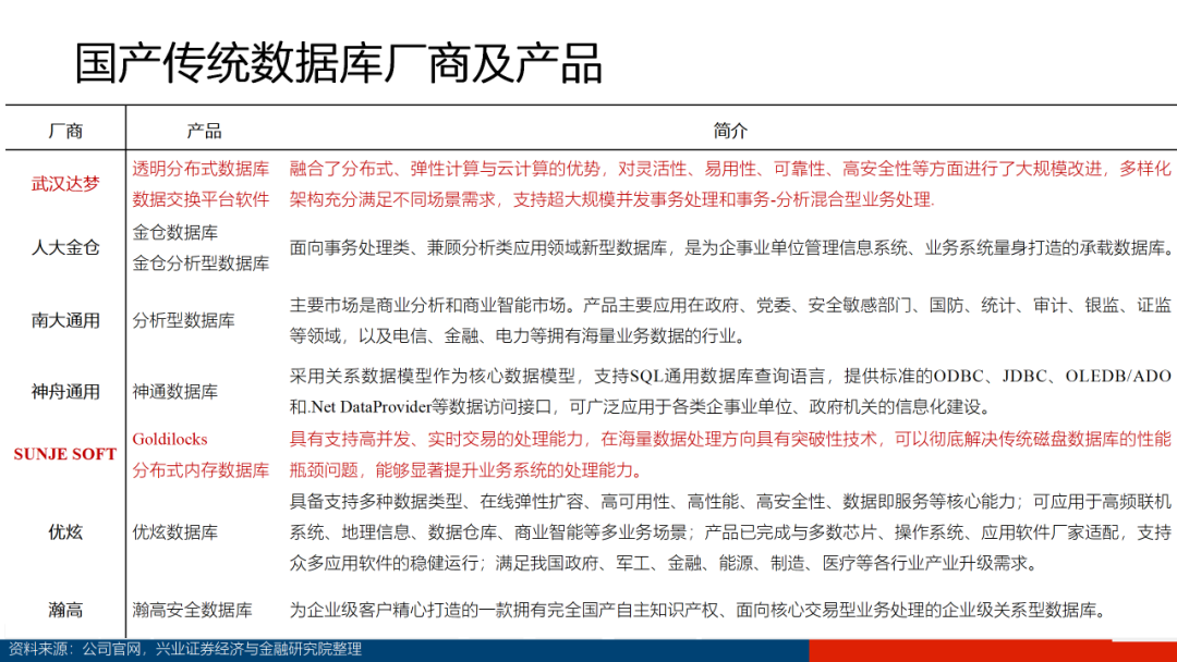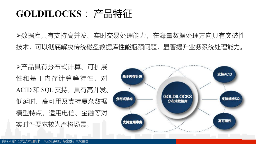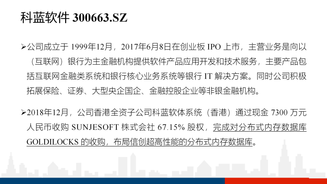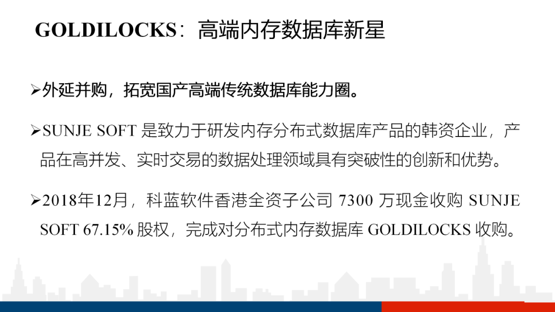 科蓝软件(300663.SZ):GOLDILOCKS(科蓝软件持有67.15%股权),高端内存数据库新星。SUNJE SOFT 是致力于研发内存分布式数据库产品的韩资企业,产品具有分布式计算、可扩展性和基于内存计算等特性,对 ACID 和 SQL 支持,具有高并发、低延时、高可用及支持复杂数据模型特点,适用电信、金融等对实时性要求较为严格场景。
