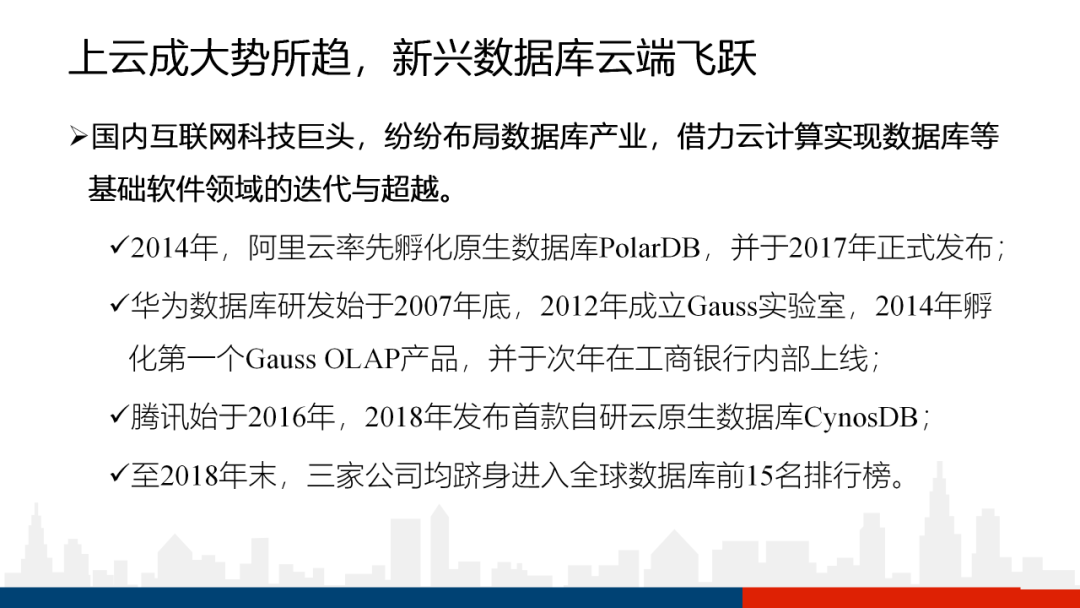 借力云计算,国内国际巨头纷纷入局。2014 年,阿里云率先孵化原生数据库 PolarDB,并于 2017年正式发布;腾讯云数据库始于 2016 年,并于 2018 年发布首款自研云原生数据库 CynosDB;加上华为的GaussDB,至 2018 年末,三家公司均跻身进入全球数据库前 15 名排行榜(图4)。传统数据库厂商也纷纷发布自研云数据库,以维持市场地位和竞争优势。