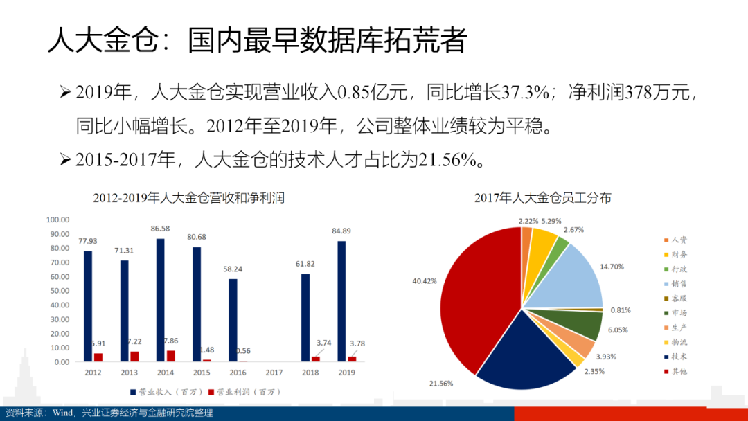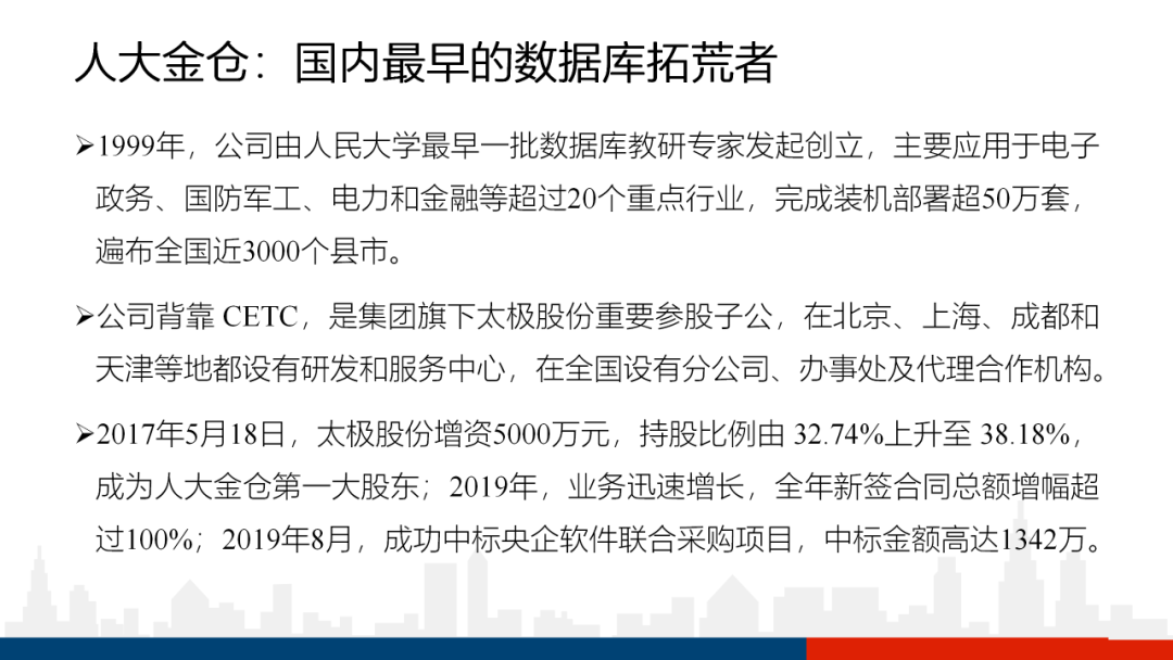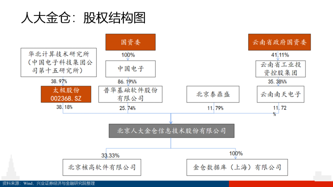 太极股份(002368.SZ):人大金仓(太极股份持有33.28%股权)成立于1999年,由人民大学最早一批数据库教研专家发起创立。主要应用于电子政务、国防军工、电力和金融等超过20个重点行业,完成装机部署超50万套,遍布全国近3000个县市。公司背靠 CETC,是集团旗下太极股份重要参股子公,在北京、上海、成都和天津等地都设有研发和服务中心,在全国设有分公司、办事处及代理合作机构。