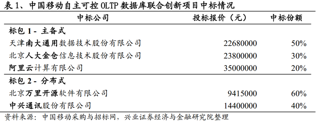 创意信息(300366.SZ):万里开源(创意信息持有58.57%股权)是MySQL的白金合作伙伴,数据库产品GreatDB于2020年7月21日公告入围“中移动信息技术有限公司自主可控OLTP数据库联合创新项目”标包2(分布式)中标候选人之一。产品线拥有单机、分布式、安全型、云、时序型、企业级等多类数据库,全线兼容X86、龙芯、飞腾、鲲鹏、海光等国内外主流芯片。