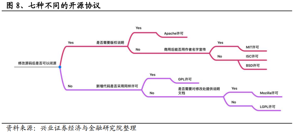 百余款开源协议,涉及源代码、版权与商业运营方方面面。当前,全球开源协议多达上百款,其中,根据源代码闭源和版权说明与否,存在七款主流协议。Linux 操作系统、MySQL数据库等遵循GPL协议,而PostgreSQL则遵循类BSD和MIT协议。然而,开源并不是免费的午餐,其中涉及复杂的知识产权等法律问题,甚至开源协议也存在被修改的风险,影响商业化运作与使用。
