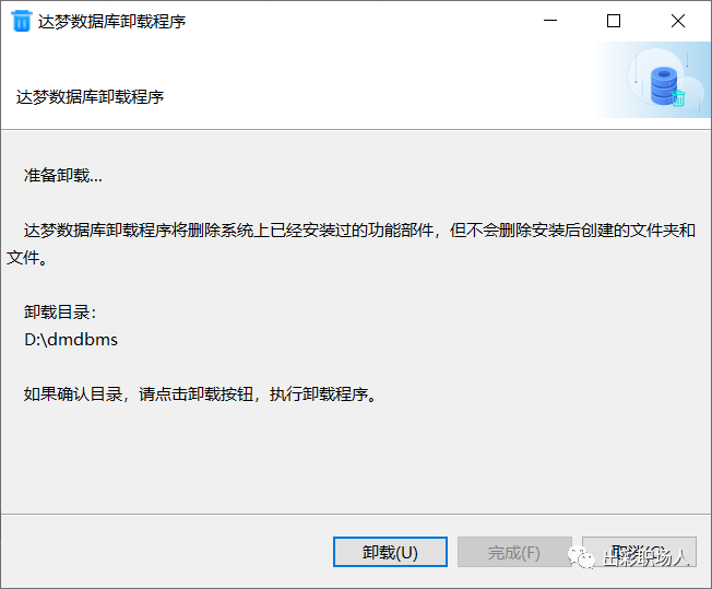 进入卸载小结,此时显示 DM 的卸载目录信息。点击“卸载”,开始卸载 DM。需要注意的是:达梦数据库卸载程序将删除系统上已经安装过的功能部件,但不会删除安装后创建的文件夹和文件。这也就意味着一部分手动添加的文件夹或文件需要手动删除。