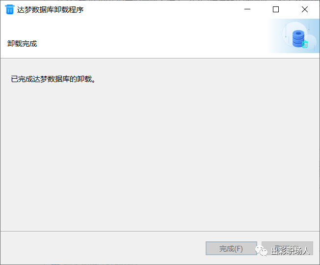 达梦数据库的卸载会显示卸载进度,这个过程比较快,不到1分钟就完成了。点击“完成”按钮结束卸载。