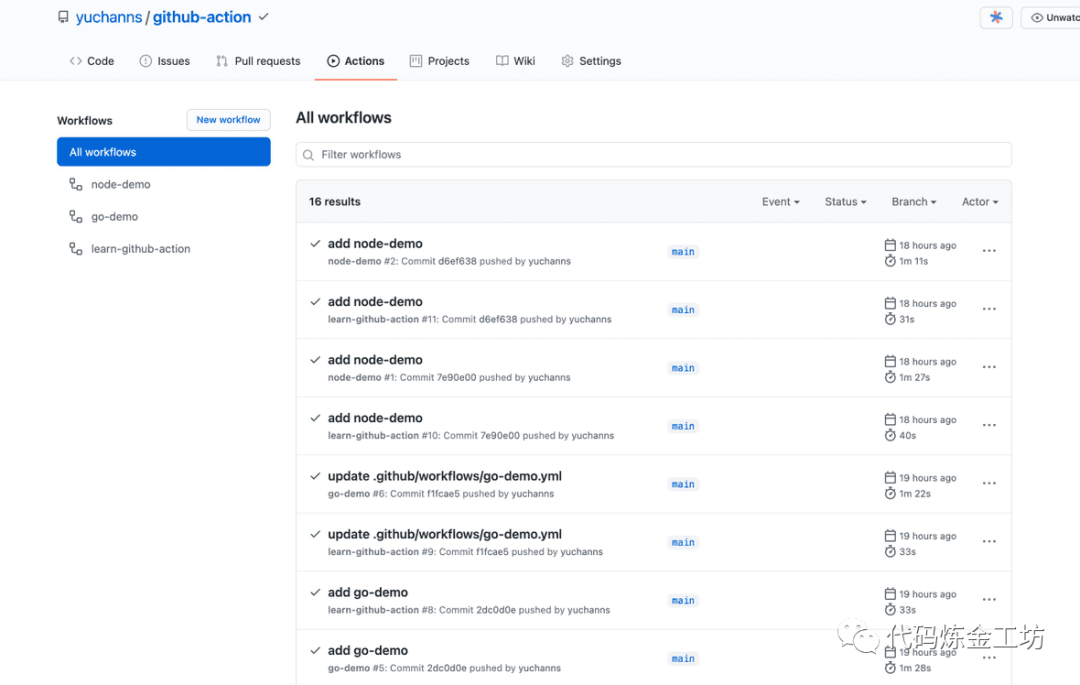 文件,就开启了该仓库的github actions功能,并且得到了第一个工作流learn-github-action。注意,yml文件可以是任意名字,一个文件就是一个工作流,这正是笔者之所以用它的重要原因。