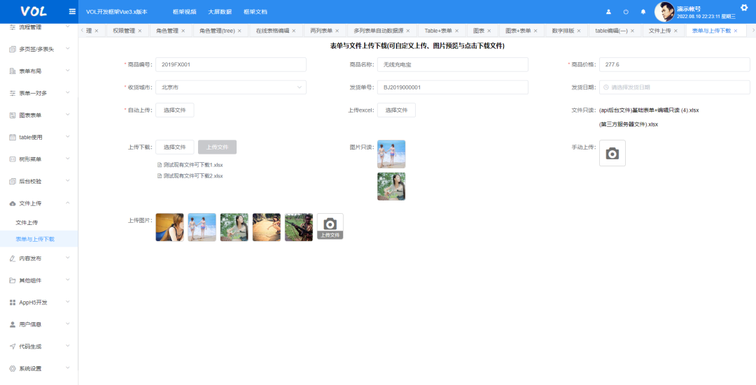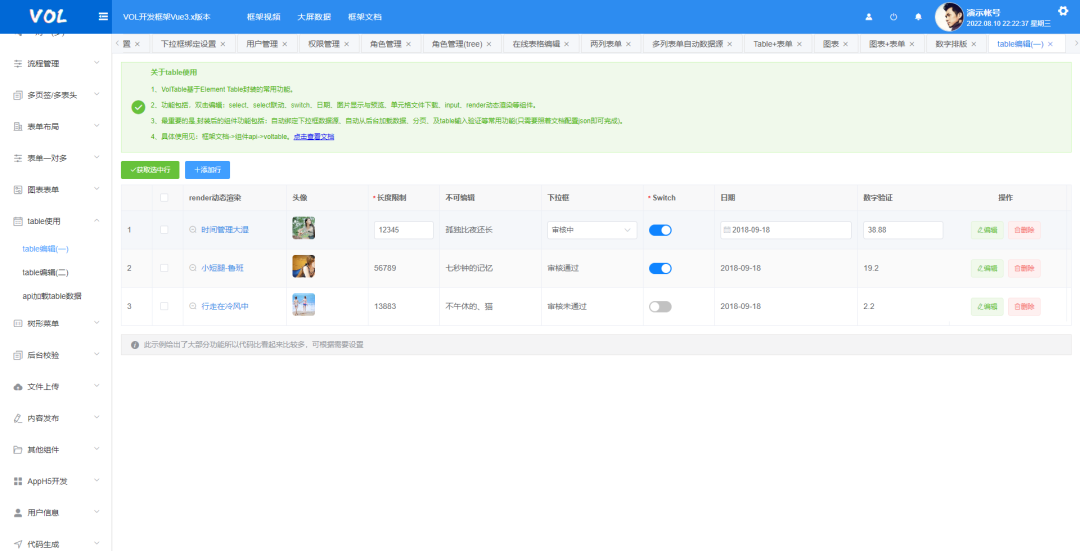 1、表单数据:基础只读表单、自动绑定下拉框、多弹出框上传、导入导出表单、编辑器表格换行、多列合并显示、在线表格编辑