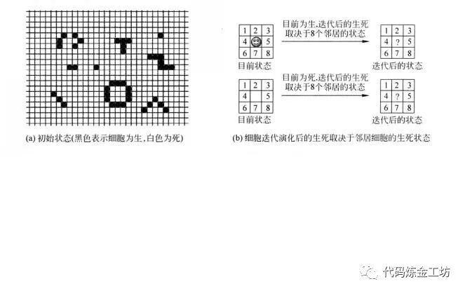 注意这里其实还隐含了第5个条件:因为前3个条件已经把活细胞的情况枚举完了,剩下的全是死细胞的情况。而死细胞只有在第4个条件下才会转化为活细胞,因此第5个条件内容是,其余死细胞继续保持死亡状态。