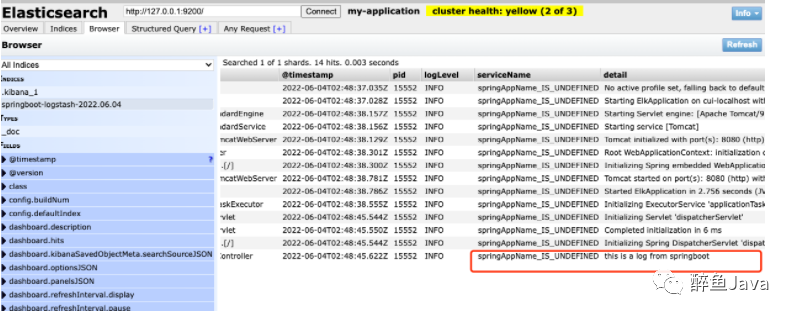 按顺序启动好了之后打开es-head插件即可查看索引信息,其中有一条调用接口的信息,还有应用启动的消息