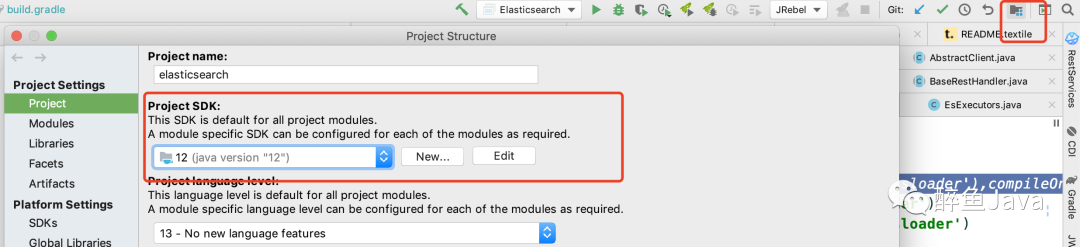,修改 compileOnly 改为compile,详细信息查看下面// compileOnly project(':libs:elasticsearch-plugin-classloader'),compileOnly 改为compile8、idea设置项目JDK与gradle版本