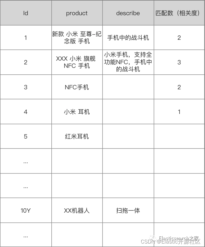 回过头来继续看当前的案例,假设每个词项在倒排索引中命中之后,我们都做一个“命中”标记,那么当前搜索的三个词项都命中了对应的Term,我们计算一下此次命中的倒排表中的id分别命中了多少次。假如此次搜索倒排表中包含了元数据中id为1,2,3,4这几条数据,我们分别计算一下每个id被命中的次数,并且把对应的结果抽象出一个字段放在元数据表格的右侧,那么这个结果就可以暂时理解为一个简单的“相关度”。我们按照这个“相关度”倒序排列元数据,就会发现,当前这个顺序基本就是符合我们正常人类对搜索结果的一个预期排序。最符合预期的结果会被排在最上面,最不符合的结果排在最下面。
